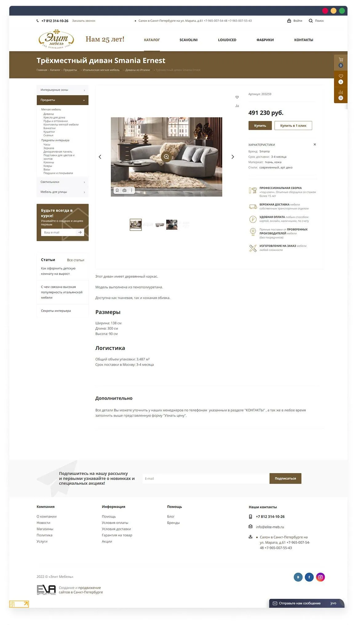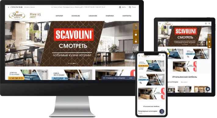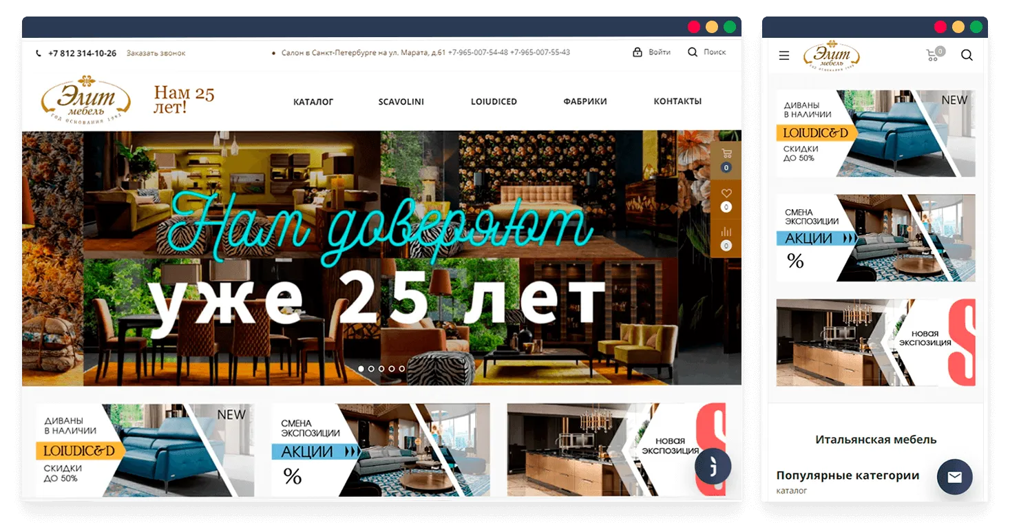 Сделали уникальный дизайн сайта, придали ему уже узнаваемый стиль. На главной странице реализовали большие и яркие баннеры с интерьерной мебелью. Сразу под баннерами разместили актуальные акции, популярные категории и последние публикации из блога компании.
